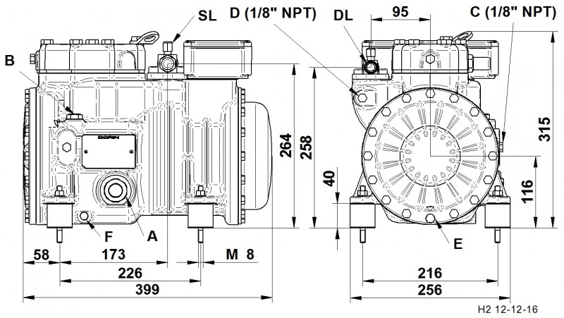 Compresor semiermetic Dorin H350SB, aplicații pentru LBP/MBP, refrigeranți R404a/R134a/R507A/R407F/R450A/R513A/R452A/R449A/R448A/R407A