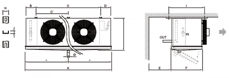 Modele Fan no.Nominal cap.of evaporator (kW)Int. surface (m²)Electrical defrost (kW)Fin spacing (mm)Air flow of evaporator (m³/h)Power supply (V/Hz/Ph)Air throw (m)