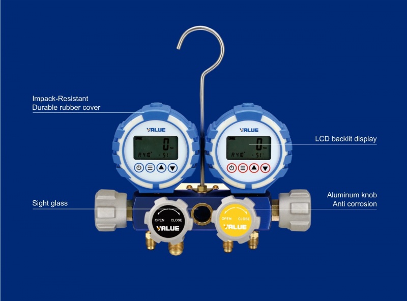 Value digital pressure gauge battery set for refrigeration and 4-way AC (R22, R32, R290, R410A, R134a, 1234yf, R404A, R407C, R507)